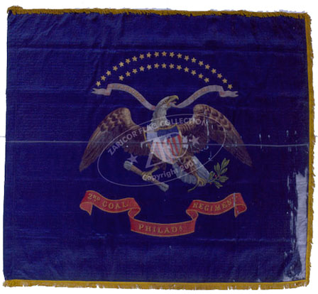 ZFC0406Â Regimental flag of the 2nd Philadelphia Coal Exchange Regiment. U.S. Volunteer Infantry, 1863. This flag is a Regimental Color from the Philadelphia Department of Pattern. Made especially by Evans & Hassell for the 2nd Philadelphia Coal Exchange Regiment, 51st Pennsylvania Militia by its sponsors, of the Philadelphia Coal Exchange. Read more