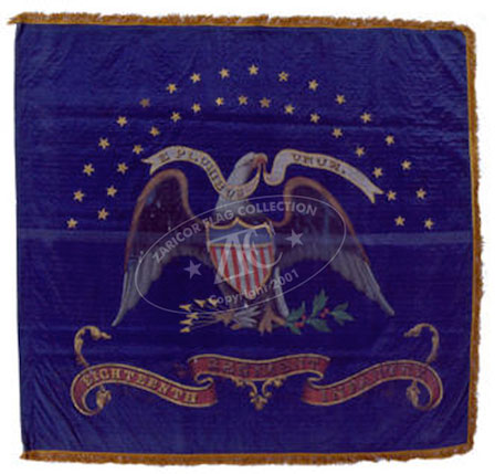 ZFC0407 18th US Infantry Regimental Color, 1863-1865. This was the 18th U.S. Regular Infantry’s regimental color in the period from 1865 through 1866. After the War, the 18th was sent West to garrison the Bozeman Trail through Wyoming Territory. It garrisoned Fort Phil Kearny in 1866 during the events leading to the Fetterman Massacre. When Fort Phil Kearny was abandoned, the adjutant of the 18th Infantry took this flag with him and it eventually passed