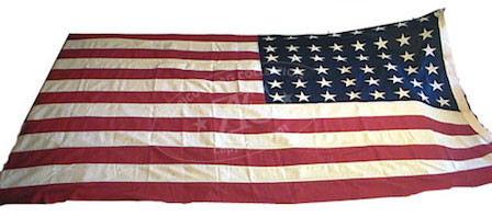 ZFC0034 United States 48 Star Military Storm Flag - This flag was made by the Philadelphia Quartermaster of the US Army late 1940’s or 1950. Used in the Korean War as a base flag for use during inclement weather. The condition of the flag suggests its use was infrequent. It was donated to the Star Spangled Banner Flag House by an unspecified person(s) in 1981. This suggests a veteran or the family of a veteran gifted the flag upon the death of the veteran which is a common practice by families in honor of the soldier