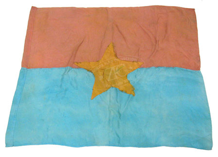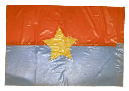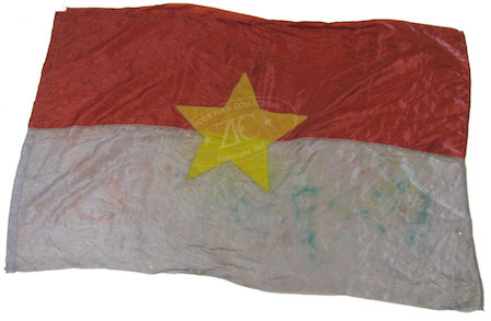 ZFC3348 This National Liberation Front (NLF) or “Vietcong†banner, unlike the majority of flags in collections and institutions in the US, was neither captured nor taken as either a trophy or booty, but rather a gift from a veteran who survived the war and kept it amongst his personal possessions. This Viet Cong banner is typical of those made in this era; it is made of locally available silk, and only has the star on one side indicating that it was designed to hang against a wall instead of flying from a free standing pole. Read more