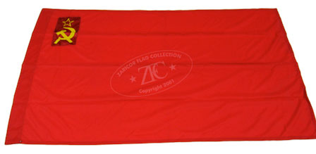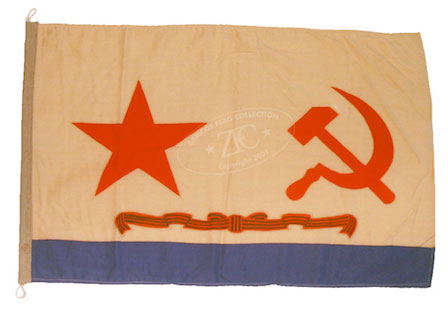 ZFC1108 The naval ensign of the Union of Soviet Socialist Republics (USSR) was adopted in 1935 and abolished in 1992 after the collapse of the USSR. The naval ensign combined traditional symbols of communism—the red star and hammer and sickle—with the white and blue colors of Russia’s old tsarist war ensign. During the Cold War the Soviet Navy played an instrumental role as the premier surface force of the Warsaw Pact. This ensign was for ships awarded the honorary title “Guards,†a Guard Ribbon in the black and orange colors of the Order of Glory (intentionally the same colors as the ribbon of the tsarist Cross of St. George) was added above the blue strip. Read more