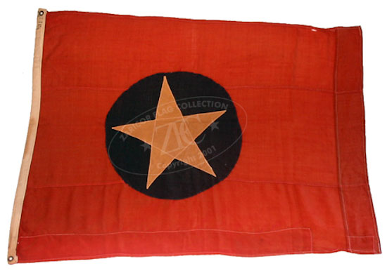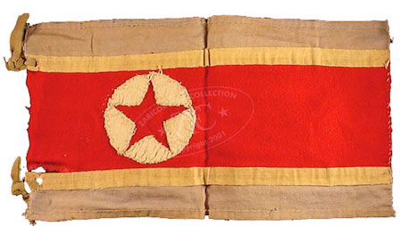 ZFC3241 This small, hand-sewn, wool and cotton North Korean Flag is a field expedient made by soldiers from materials they had at hand. The red star is created by the cutting away of a star-shaped section of the white cloth circle appliquéd to the red center stripe. The fimbriation on either side of the red stripe is made from two strips of white adhesive bandage tape, presumably from a field medical kit. The flag's previous owner, the now defunct Soldiers’ Museum of Davenport, Iowa, reported that it was a GI “Bring Back†from a veteran who served in both WWII and Korea. They identified it as a military vehicle pennant. North Korean flags from the conflict are quite rare for reasons still not clearly understood. Read more
