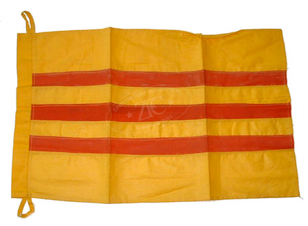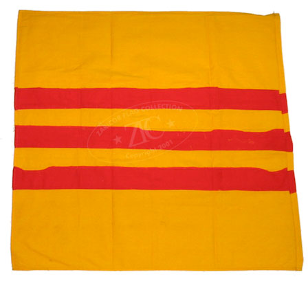 ZFC1501Â The Flag of the Republic of Vietnam, three red horizon- tal stripes on golden yellow was simple and easy to produce and this home-made cotton attests. Although it does not conform to the official proportions of 2:3, this nearly square cotton flag is clearly identifiable. Flags like this were popular items for returning GIs