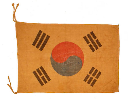 ZFC1515Â This small cotton South Korean flag is a souvenir of the Korean War. Small flags like this were likely used for patriotic pur- poses to boost South Korean moral and national pride. They could also be used on South Korean military vehicles, to further identify them, as they were all supplied by the United States. The well used flag is typical of flags brought home by returning GIs as a memento of service. Read more