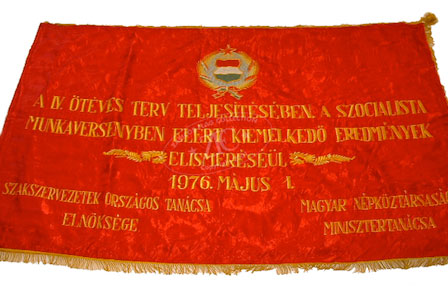 ZFC2345 Hungary Peoples Republic Cold War era Propaganda & Morale Flag for the fourth five year plan of 1 March 1976. This flag awarded by the Hungarian People’s Ministry, recognizes the outstanding productivity of the Trade Unions. Red flags like this were ubiquitous in the Soviet Bloc for distribution to civilians