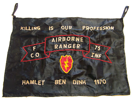 ZFC2461 Theatre made “Hooch Banner†Team 38, Company F, 75th Infantry, 3rd Brigade, and 25th Division. Nicknamed the “Tropical Rangersâ€, they served near the infamous Chu Chi tunnel complex. This unofficial banner is typical of locally acquired flags use by soldiers and units to decorate their living quarters and com- pany areas. They served as moral builders and reflected unit pride. They often included insignias, unit designations, patriotic slogans, or mottos which often reflected macabre humor common at the front. Read more