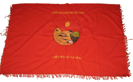 ZFC2491 This is a People’s Army of Vietnam (PAVN) Ho Chi Minh Campaign banner from 1975. This embroidered banner was de- signed to be viewed from one side only and is propaganda and moral banner made for the Ho Chi Minh Campaign of 1975, the final North Vietnamese and Viet Cong (VC) assault on Saigon (Ho Chi Minh City). The inscriptions, Quân đội Nhân dân Việt Nam and Chiến dịch Hồ Chà Minh above and below the central emblem, and the details of the embroidered insignia, of a North Vietnamese sol- dier in the foreground under a red flag bearing a likeness of Ho Chi Minh and North Vietnamese military might in the background, clearly indicate the North Vietnamese support for this final cam- paign of the Vietnam War. Banners like this would have been used to inspire troops at training and briefing facilities prior to the launch of the campaign. The campaign was highly successful, allowing the combined PAVN/VC force of 187,000 to defeat a South Vietnamese force four times its size in less than two months. Read more