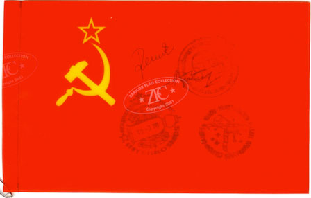 ZFC3152Â This national flag of the Union of Soviet Socialist Republics was carried aboard the Salyut 6, a Soviet orbital space station, launched on September 29, 1977. Although it was after the successful American lunar landing, the USSR continued the Space Race from orbiting space stations. This flag bears the mission stamps of the Salyut Program. Read more