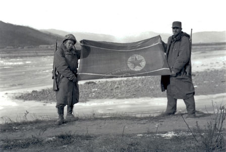 ZFC3249Â This photographic reprint shows two US Marines, Sergeant Richard E. Cly and an unidentified Marine rifleman displaying a captured North Korean flag after the fierce fighting at Chosen Reservoir in November and December 1950. Sgt. Cly, of Minneapolis, Minn served with the 2nd Battalion, 7th Marines in Korea. The original image, #127-GK-234A-A4692, is in the collections of the National Archives and Records Administration. Read more