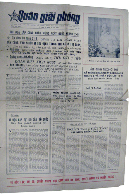 ZFC3354Â VC Quan Giai Phong Newspaper - This an issue of the newspaper of the National Liberation Front of South Vietnam, dated 2 September 1968, from the period after both the Tet offensive of January/February, and the mini Tet of May & August 1968. The paper was an important source of both propaganda and moral justification for the Viet Cong soldiers. Read more