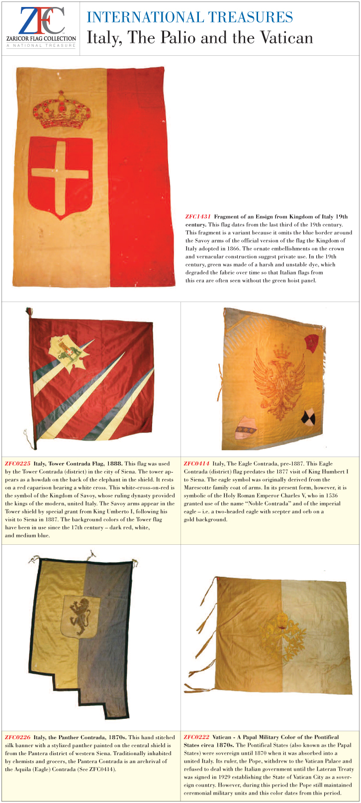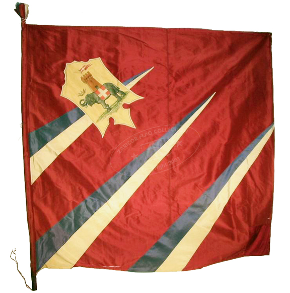 ZFC0225 - Italy, Tower Contrada Flag, 1888. This flag was used by the Tower Contrada (district) in the city of Siena. The tower appears as a howdah on the back of the elephant in the shield. It rests on a red caparison bearing a white cross. This white-cross-on-red is the symbol of the Kingdom of Savoy, whose ruling dynasty provided the kings of the modern, united Italy. The Savoy arms appear in the Tower shield by special grant from King Umberto I, following his visit to Siena in 1887. The background colors of the Tower flag have been in use since the 17th century – dark red, white, and medium blue.