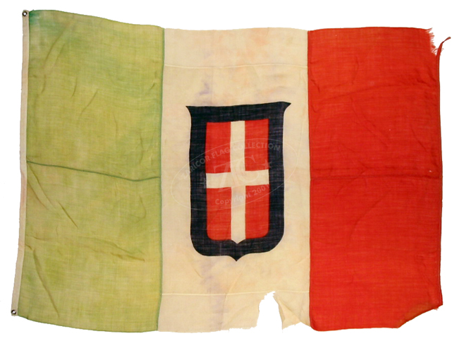 ZFC0329 - Civil and Merchant Flag from the Kingdom of Italy. This was the "Merchant Flag" of Italy from 1866 to 1946. Examples like this American-made flag were used by U.S. merchant marine vessels trading with Italy. They were also very popular with Italian American emigrant groups in the United States. This wool flag is marked in feet with metal grommets; the hallmarks of American, rather than European, manufacture.