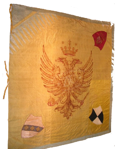 ZFC0414 - Italy, The Eagle Contrada, pre-1887. This Eagle Contrada (district) flag predates the 1877 visit of King Humbert I to Siena. The eagle symbol was originally derived from the Marescotte family coat of arms. In its present form, however, it is symbolic of the Holy Roman Emperor Charles V, who in 1536 granted use of the name "Noble Contrada" and of the imperial eagle – i.e. a two-headed eagle with scepter and orb on a gold background.