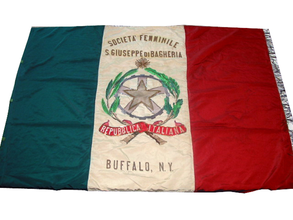 ZFC0986 - Italian - Societa Femminile S. Giuseppe Di Bagheria. Buffalo, New York – This is the flag of the Women of the St. Joseph Di Bagheria Society, an Italian-American non-profit organization founded in 1938. The flag bears the arms of the Italian Republic, adopted in 1948; the reverse displays the arms of the city of Bagheria, Sicily. The St. Joseph di Bagheria Society was founded in 1900 to aid recently arrived Italian emigrants.