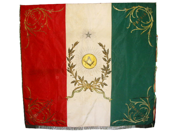 ZFC0991 - Italia Associazione Gian Battista Amendola da Sarno The Association of John the Baptist of Sarno [Italy]), New York, 1904. This ornately embroidered Italian tricolor is double-faced. The flag bears the royal Italian arms on the obverse and the Masonic level and dividers on a sun. Fraternal associations were common in the immigrant communities of the large coastal cities of the United States. Organizations like this were founded for mutual benefit, fraternization, socialization, and preservation of identity and culture. The flag of this group from Sarno, Italy combines Royal Italian, Masonic and Religious symbols.