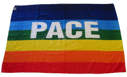 ZFC1003 - Italian Pace da tutti i balconi, "Peace from every balcony movement." The rainbow flag was first utilized in Italy during a Peace march in 1961. In 2002, in protest of the impending Iraq War, it quickly became associated with the Pace da tutti i balconi ("peace from every balcony") movement where the Italian word PACE, "PEACE" was displayed prominently across the top of the flag. The flag has since spread worldwide. It should not be confused with the Gay Pride Rainbow flag made popular in the United States in the 1980s.