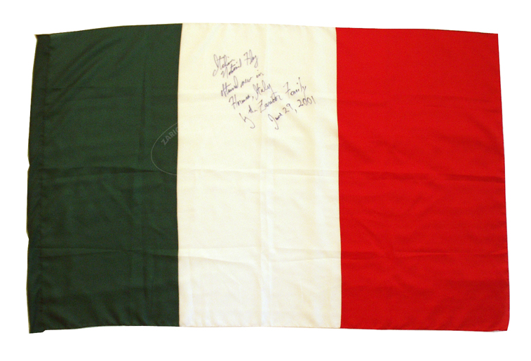 ZFC1061 - Italian National Flag, 2001. Flags always have been and remain a popular souvenir for travelers as in this example from Italy. It is inscribed "Italian national flag obtained in Florence, Italy by the Zaricor Family, June 29 2001." This flag was acquired new and is an exception in the Zaricor Flag Collection, which almost always acquires used and historical flags.