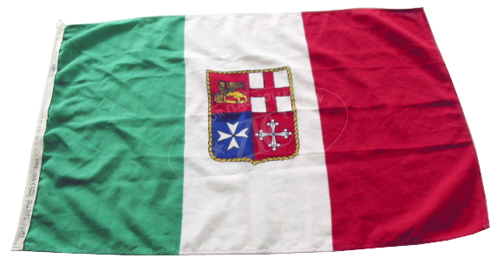 ZFC2211 - Italian Merchant Flag. The Italian flag overlaid with the arms of the four so-called "Sea Republics," which are, by tradition: Venice, bearing the winged lion of St. Mark's; Genoa, with a red cross on white; Amalfi, showing a white Maltese cross on blue; and Pisa, flying a Pisan cross with keys (or paws) and three spheres on every arm. Adopted in 1947, the Italian merchant flag is used on Italian pleasure craft and merchant vessels.